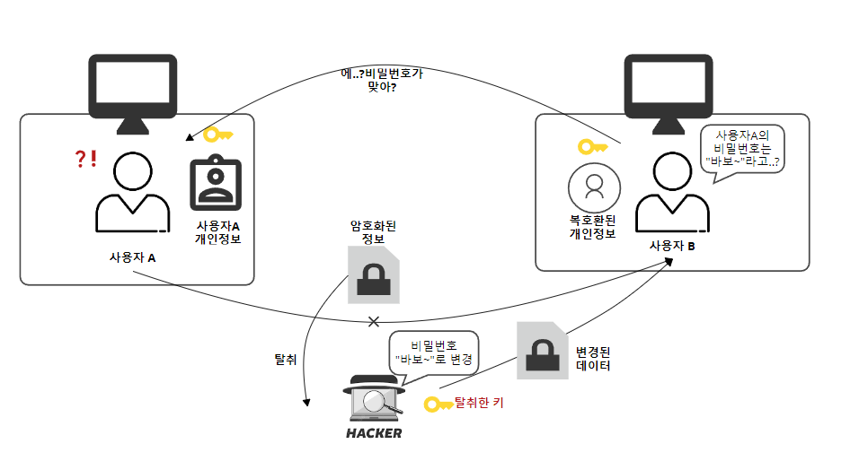 하지만 앞서 보안에 취약할 수 있다고 했습니다. 그림과 같이 중간에 탈취한 키를 가지고 A가 B에게 개인정보를 보낼 때 갖추래 개인정보를 변경하고 사용자 B는 복호화를 진행하고 정보를 봤는데 이상한 정보가 적혀있다면? 의심하게 될 수 있다. 하지만 엇비슷하게 내용을 변경하게 된다면 B는 정보가 해킹당했는지 모르고 사용하게 되면서 무결성이 깨지는 결과를 초래할 수 있다. 그래서 키보관을 철저히 해야 하는 알고리즘이다.