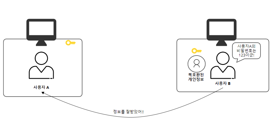 사용자 B는 A와동일한 "황금색 KEY"를 사용해 복호화하여 A의 개인정보를 확인할 수 있습니다. 비밀번호가 "123"인 것도 확인하고 다시 정보를 잘 받았어!라고 응답을 하게 됩니다.