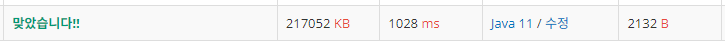결과를 실행해 보면 다음과 같이 성공하는 것을 볼 수 있습니다. 자바의 알고리즘 특성상 코드가 길어지고 다른 언어에 비해 속도가 느리기 때문에... 1028ms가 나오네요...ㅜㅜ
